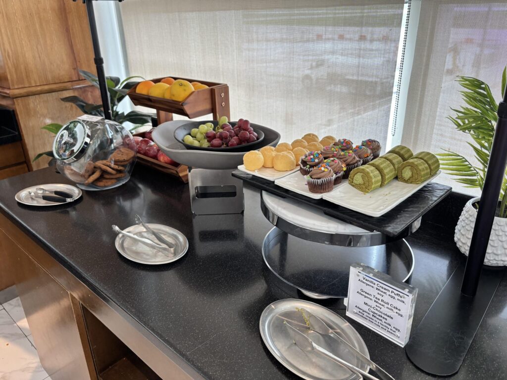 プライオリティパスで入れるラウンジと侮るなかれ。食事やドリンクのメニューは意外と充実しています。ホットミールやサラダ、デザートまで一通り揃っており、ユナイテッドクラブと比較しても遜色ありません。