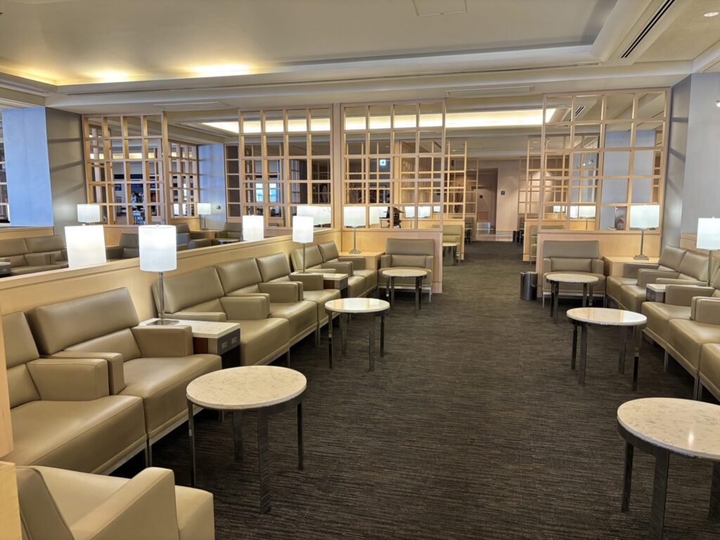 まず驚くのがその広さ!座席数はなんと670席。これは成田空港のラウンジの中でも最大級です。ANAラウンジも広いですが、ユナイテッドクラブは天井も高く、座席間のスペースがゆったり取られているため、開放感が段違いです。